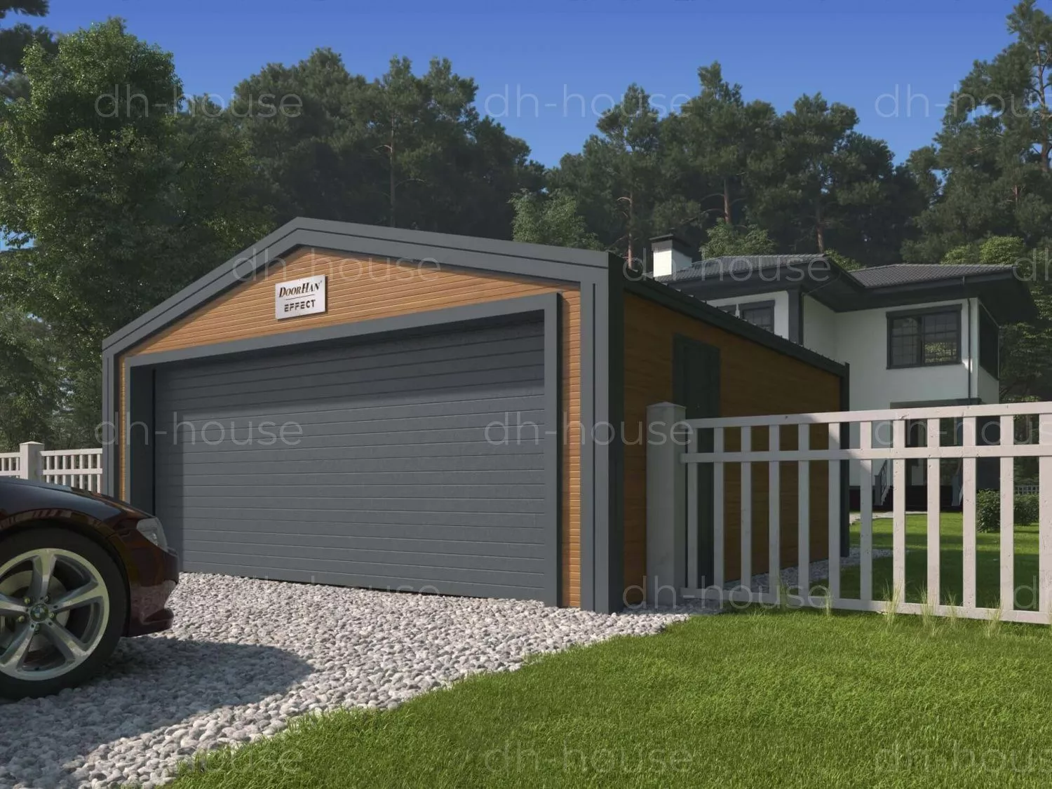 Гараж DoorHan представляет собой двускатное строение для стоянки автомобиля в Омске. Выполнен в виде прямоугольной конструкции. Несущую функцию выполняет металлический каркас, собранный из профиля С-образной формы с оцинкованной поверхностью. Для обшивки кровли и стен выбраны PIR-панели. Цвета внешних стеновых панелей — золотой дуб, кровельных уличных панелей — RAL 7016, стен и кровли внутри — RAL 9003.